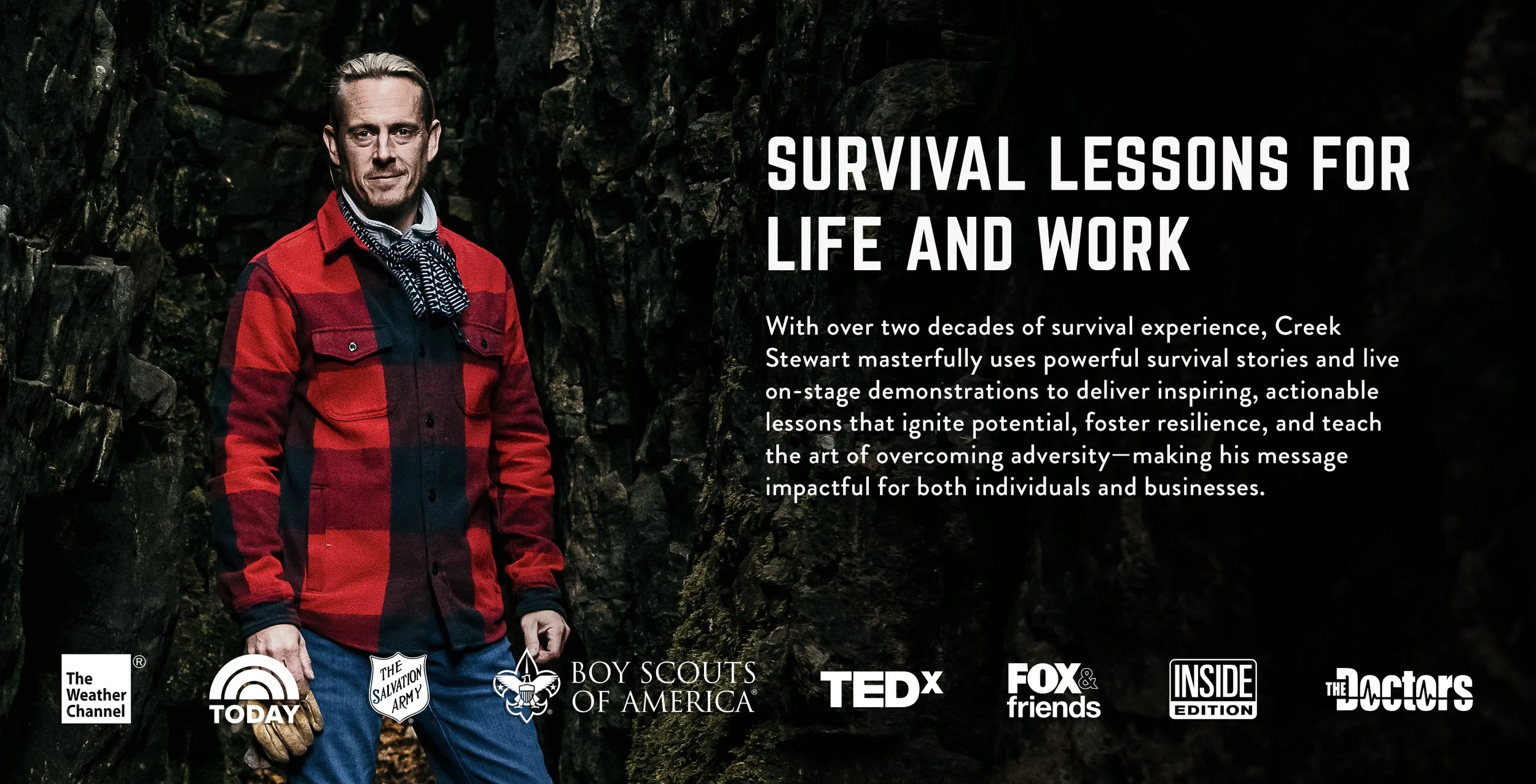 Drawing from his real-life survival scenarios and wilderness expertise, Creek Stewart reveals essential life lessons learned from the wild. In this compelling program, Creek will teach you how to harness resilience, creativity, and perseverance to overcome life's toughest challenges. Through captivating stories and practical demonstrations, you will discover how survival skills can be applied to personal and professional growth.