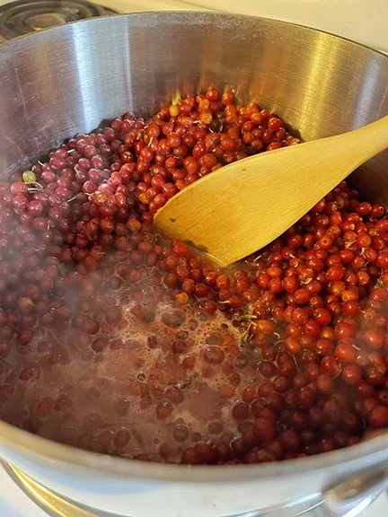 Simmering Autumn Olive Berries to soften.