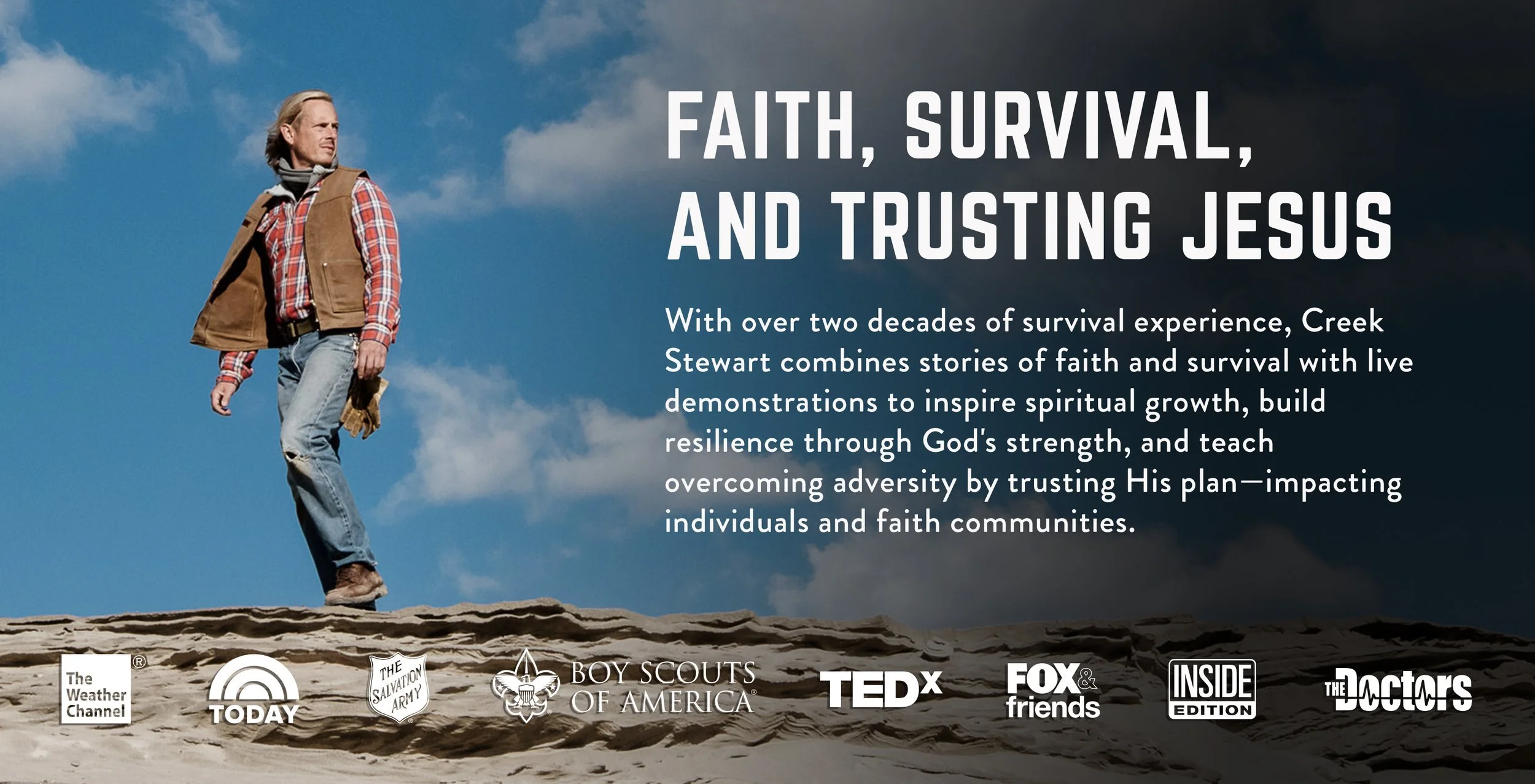 Whether he’s sharing survival strategies or biblical principles, Creek Stewart’s goal as a motivational Christian speaker is to help others develop the resilience needed to thrive in both life and faith. His ability to seamlessly blend practical survival advice with spiritual insights makes him an ideal speaker for anyone looking to strengthen their walk with God, embrace challenges, and discover their God-given purpose.